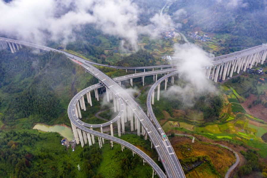 11月10日,吉首市石家沖街道,石家寨互通立交橋周邊,高速公路穿行于云霧繚繞的峽谷峰巒間,時隱時現,構成一幅氣勢磅礴的山水畫卷。劉振軍 攝(湖南圖片庫)