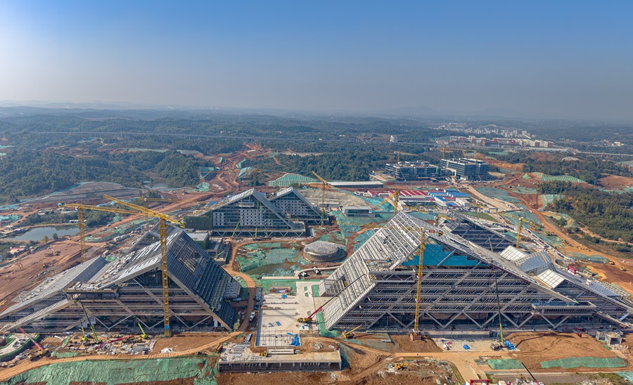 11月14日,湘江科學(xué)城交易展示中心建設(shè)現(xiàn)場(chǎng)一派繁忙。目前,項(xiàng)目東西立面幕墻玻璃安裝已進(jìn)入收尾階段,斜屋面鋁板施工完成60%,外立面初具規(guī)模。湖南日?qǐng)?bào)全媒體記者 童臻熙 攝