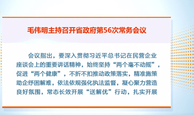 2月24日下午,省長毛偉明主持召開省政府第56次常務會議,傳達學習習近平總書記近期重要講話和指示批示精神,研究部署支持民營企業發展、中央巡視反饋問題整改、“十五五”規劃編制、穩定發展糧食生產、促進政府投資基金高質量發展等工作。[詳細內容]