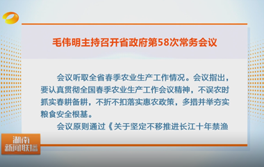 4月8日下午,省長毛偉明主持召開省政府第58次常務會議,傳達學習習近平總書記近期重要講話和指示批示精神,研究部署春季農業生產、推進長江十年禁漁、高速公路網規劃、大氣污染防治、試點引領新型城鎮化戰略、省政府立法計劃等工作。[詳細內容]