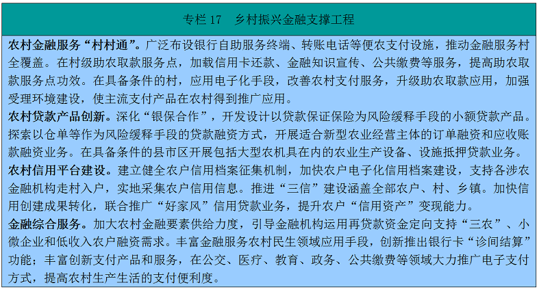 188.創新金融支農產品和服務。支持發展農戶小額貸款、新型農業經營主體貸款、種養業貸款等產品。開展林權抵押貸款,推進農村土地承包經營權、農民住房財產權抵押貸款等試點。進一步推廣“財銀保”“惠農擔”等系列產品,鼓勵銀行、擔保、保險等機構圍繞品牌打造開發新的支農產品,為農村小微企業、農民、殘疾人、低收入群體等提供普惠金融服務。推廣使用手機銀行、網上銀行等支付手段。鼓勵縣域法人金融機構將新增存款一定比例用于當地貸款。健全貧困村金融扶貧服務站運轉長效機制,拓展金融服務功能。推動湖南股權交易所和湖南金融交易中心服務下沉,開發一批適合湖南涉農企業的股權和債權融資工具。