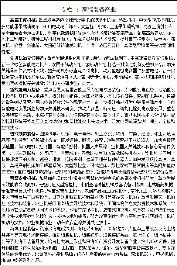 以市場應用為牽引、自主可控為導向、技術引領為支撐、轉型升級為主線、兩化融合為手段,加大重要產品和重大技術攻關力度,不斷提升產業基礎能力和產業鏈現代化水平,促進產業鏈向兩端延伸、向高端攀升,不斷突破一批“大國重器”,大力推進關鍵生產設備、零部件和材料國產化替代,著力培育以工程機械、軌道交通裝備、航空航天為代表的世界級產業集群,壯大形成新能源與智能網聯汽車、新型能源與電力裝備、智能制造裝備、電子信息裝備、智慧智能農業機械、海洋工程裝備等一批優勢特色集群,打造國家重要先進制造業高地。