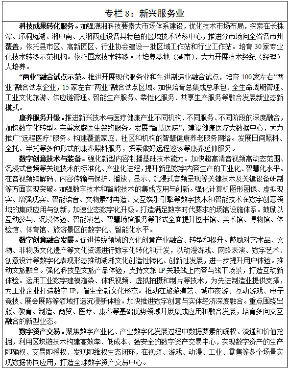 立足湖南戰略性新興產業發展基礎,加快發展高端裝備、新材料、航空航天、新一代信息技術、生物、節能環保、新能源及智能網聯汽車、新興服務業和未來產業等九大產業。