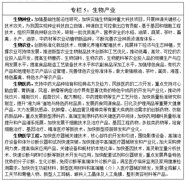立足產業發展基礎,面向農業及人民健康生活等經濟社會發展重大需求,加強生物產業基礎和應用研究,重點發展生物種業、生物農業、生物醫藥、生物醫學工程等優勢特色領域,實現生物產業規模和發展水平雙提升。