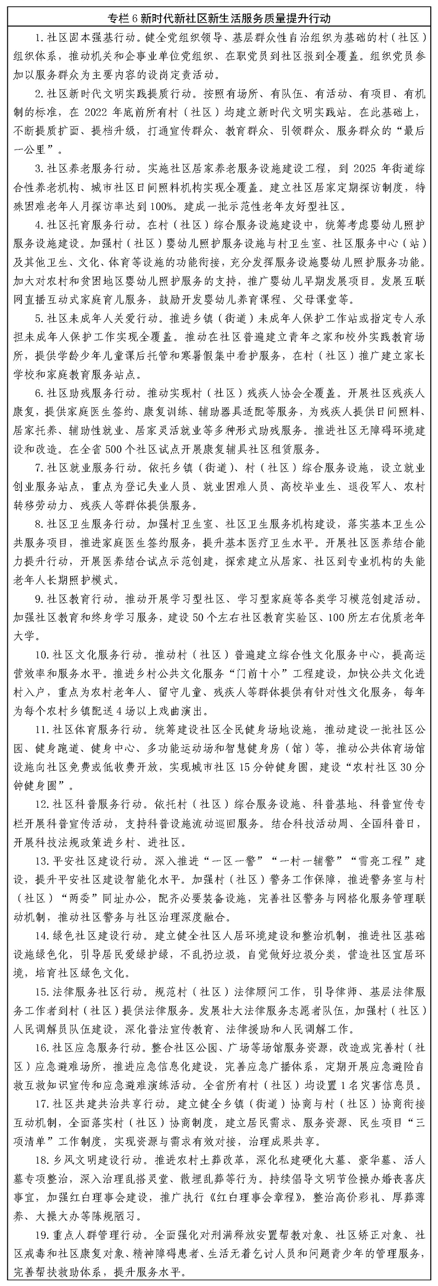 到2025年末,黨建引領城鄉社區服務體系建設更加完善,服務主體和服務業態更加豐富,服務手段更加智能,精準化、精細化水平持續提升,村(社區)為民、安民、便民功能充分發揮,人民群眾操心事、煩心事、揪心事更好解決,獲得感、幸福感、安全感不斷增強。