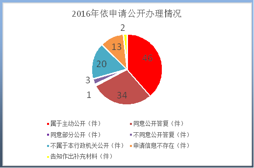 (二)辦理情況。2016年,省食品藥品監(jiān)督管理局共受理公開政府信息申請120件,其中,已依法按程序辦結(jié)119件(另有1件正在征求第3方意見)。根據(jù)《中華人民共和國政府信息公開條例》相關(guān)規(guī)定,在119件答復(fù)件中,屬于主動公開的46件,同意公開答復(fù)34件,同意部分公開的1件,不同意公開答復(fù)的3件(申請公開的信息不是《條例》所指的政府信息),不屬于本行政機關(guān)公開的20件,申請信息不存在的13件,告知作出補充材料的2件。從數(shù)據(jù)上分析,由于今年推行食品藥品行政審批制度改革,下放了一大批食品藥品、醫(yī)療器械行政審批許可項目,導致非本機關(guān)政府信息申請數(shù)量占比較大。