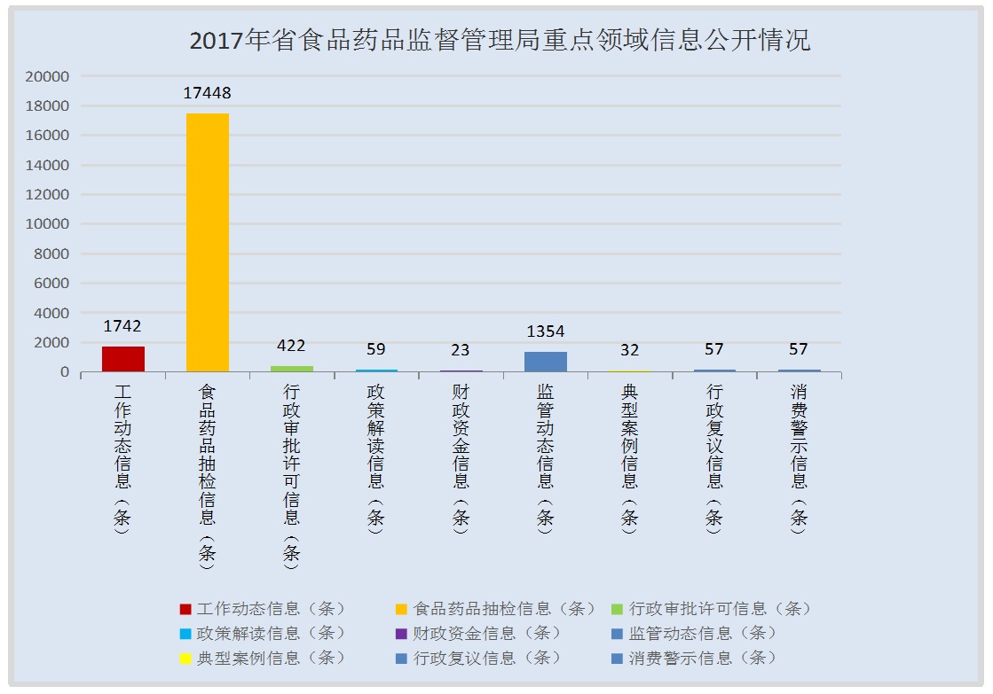 1.信息公開總體數量。2017年湖南省食藥監局本級主動公開食藥監管信息20901余條,比2016年增加2076條,同比增長11%,主要原因是2017年著力推進了食品藥品抽檢信息公開、行政許可處罰“雙公示”、食品藥品信用信息公開、消費警示、食藥科普等工作,政府信息主動公開數量大幅增長。