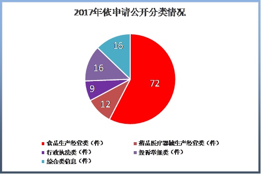 (一)受理情況。2017年1月1日至12月31日,湖南省食藥監局共收到政府信息公開申請125件。按申請人居所分析,省內申請28件,省外申請97件,分別占依申請公開總量22.4%、77.6%;按申請渠道分析,當面申請1件,信函申請50件,網絡郵件申請74件,分別占依申請公開總量0.8%、40.0%、59.2%;從食藥監管業務類別分析,食品生產經營類72件,藥品、醫療器械生產經營類12件,行政執法類9件,投訴舉報類16件,其他綜合類信息16件,分別占依申請政府信息總量的57.6%、9.6%、7.2%、12.8%、12.8%。數據顯示:2017年依申請公開省外多于省內;網絡郵件已經超過信函申請,成為依申請公開的快捷道;食品生產類信息依申請公開占大多數,且呈上升趨勢。