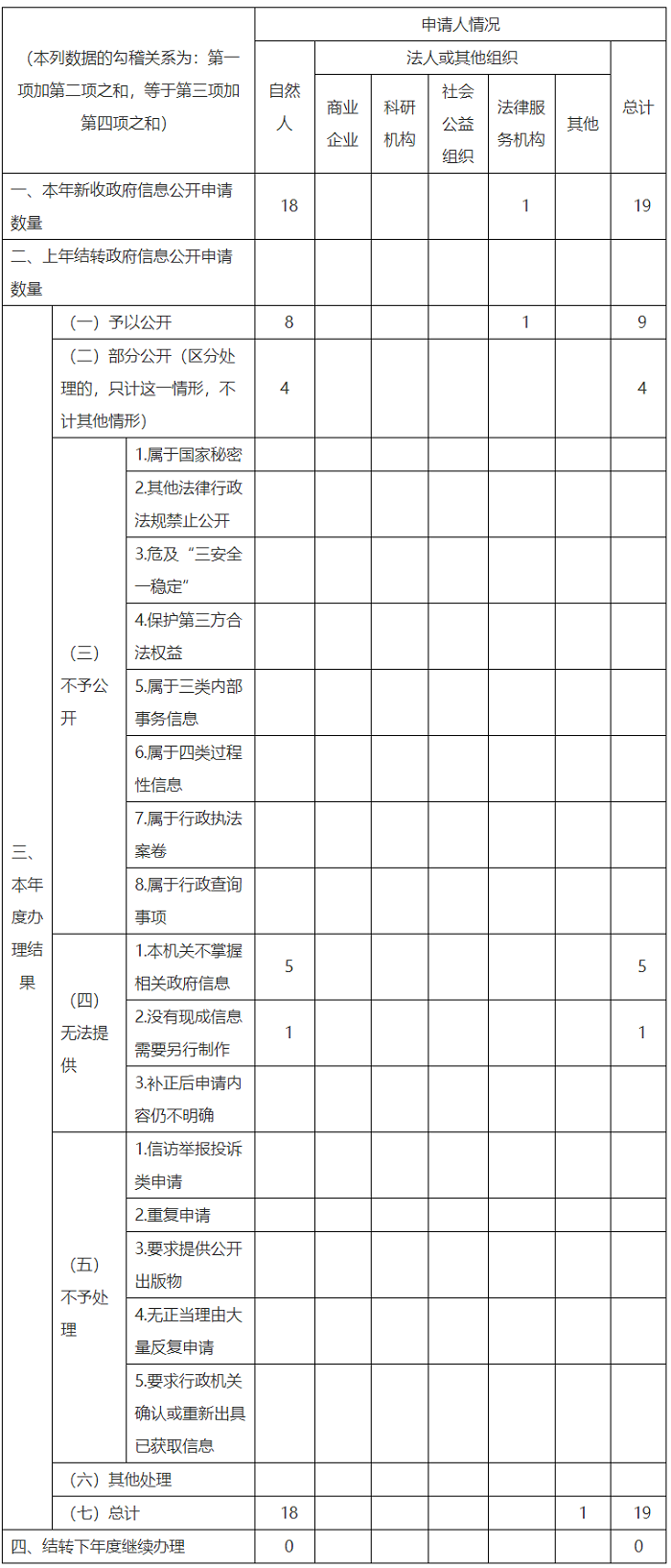 收到政府信息公開申請19件,其中面呈申請6件,傳真申請1年,信函申請12件。對19件依申請公開全部依法辦理。其中,同意公開答復9件;同意部分公開答復4件;不屬于本機關公開5件;申請信息不存在1件;告知通過其他途徑辦理8件。全年未收取任何費用。