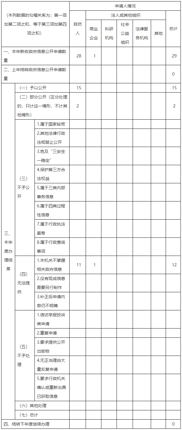 收到政府信息公開申請29件,對29件依申請公開全部依法辦理。其中,同意公開答復(fù)15件;同意部分公開答復(fù)2件;本機(jī)關(guān)不掌握相關(guān)政府信息12件。