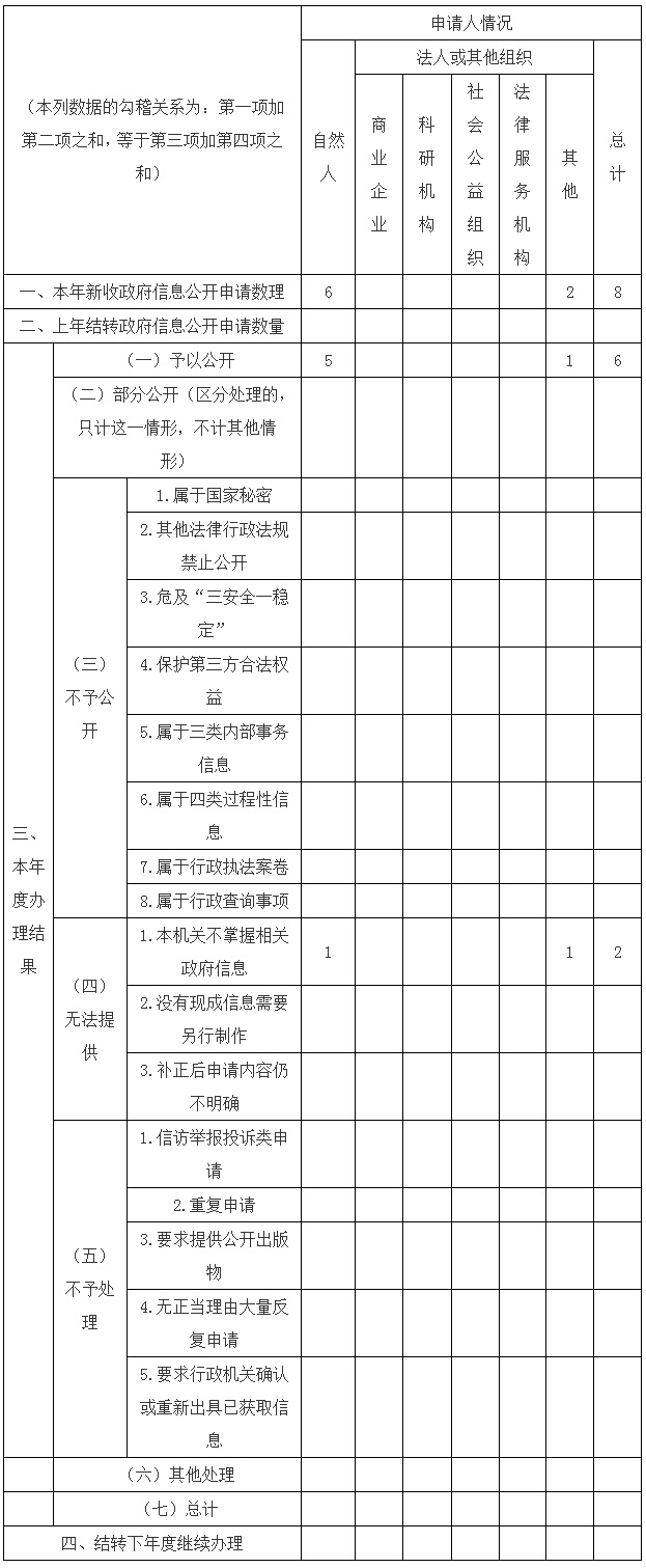 2、依申請(qǐng)公開(kāi)政府信息情況。全年受理政府信息公開(kāi)申請(qǐng)8件,申請(qǐng)形式均為信函申請(qǐng),其中符合依申請(qǐng)公開(kāi)條件的6件,都得到了申請(qǐng)人的滿意評(píng)價(jià)。