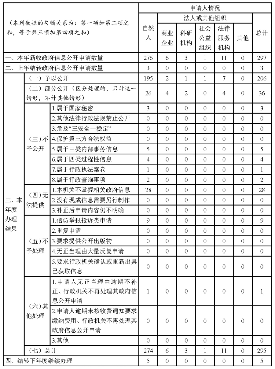 (二)依申請公開情況。嚴格執行政府信息公開條例有關依申請公開的規定,依法辦理政府信息公開申請件。2022年收到政府信息公開申請297件,結轉上年度政府信息公開申請3件,共辦理完成295件,結轉下年度繼續辦理5件;發生行政復議3件,其中3件維持;發生行政訴訟5件,其中3件維持,2件尚未審結。