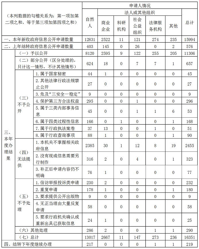 (二)依法辦理政府信息公開申請。各級各部門堅持合法、便民的原則,對公民、法人和其他組織申請公開政府信息能提供的積極提供,不能提供的依法做好答復說明。2019年全省共收到依申請公開件15994件,上年度結轉辦理件576件,共辦理完成16351件,結轉到2020年辦理219件。其中,省政府辦公廳(政務局)2019年收到依申請公開235件,辦理完成225件,結轉到2020年辦理10件;發生行政復議1件,暫未審結;發生行政訴訟5件,已經審結4件,沒有發生敗訴情形。