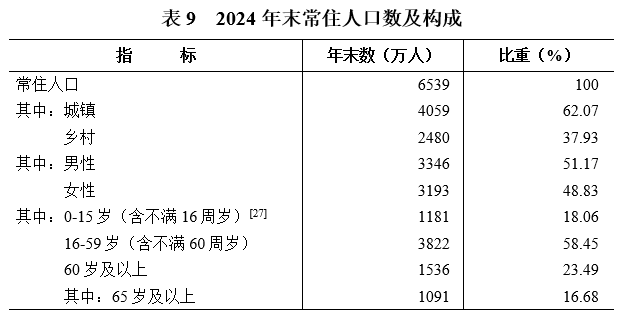 [27]2024年末,全省0-14歲(含不滿15周歲)人口為1084萬人,15-59歲(含不滿60周歲)人口為3919萬人。