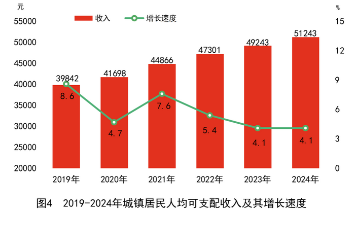 全年全省居民人均可支配收入37679元,比上年增長5.0%;居民人均可支配收入中位數[28]30000元,增長4.9%。按常住地分,城鎮居民人均可支配收入51243元,增長4.1%;城鎮居民人均可支配收入中位數45524元,增長4.2%。農村居民人均可支配收入22204元,增長6.1%;農村居民人均可支配收入中位數19699元,增長6.0%。城鄉居民收入比由上年的2.35縮小為2.31。分區域看,長株潭地區全體居民人均可支配收入56350元,增長4.2%;湘南地區全體居民人均可支配收入34998元,增長5.3%;大湘西地區全體居民人均可支配收入26402元,增長5.6%;洞庭湖地區全體居民人均可支配收入35330元,增長4.8%。脫貧縣[29]農村居民人均可支配收入17111元,增長6.7%。