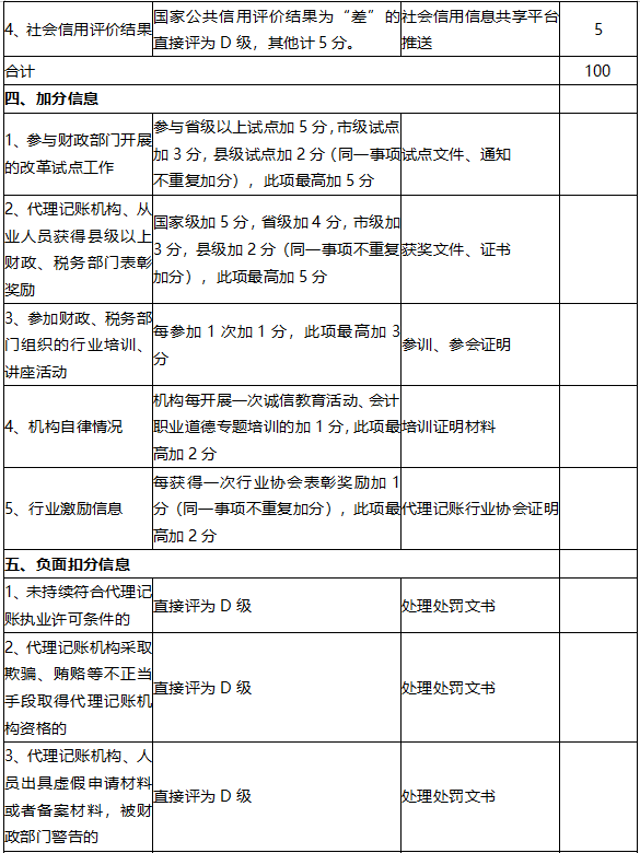 第九條 代理記賬機構信用評價基本分為100分,包含機構合規信息、日常監督檢查信息、部門協同監管信息,在此基礎上,另設加分信息以及負面扣分信息。