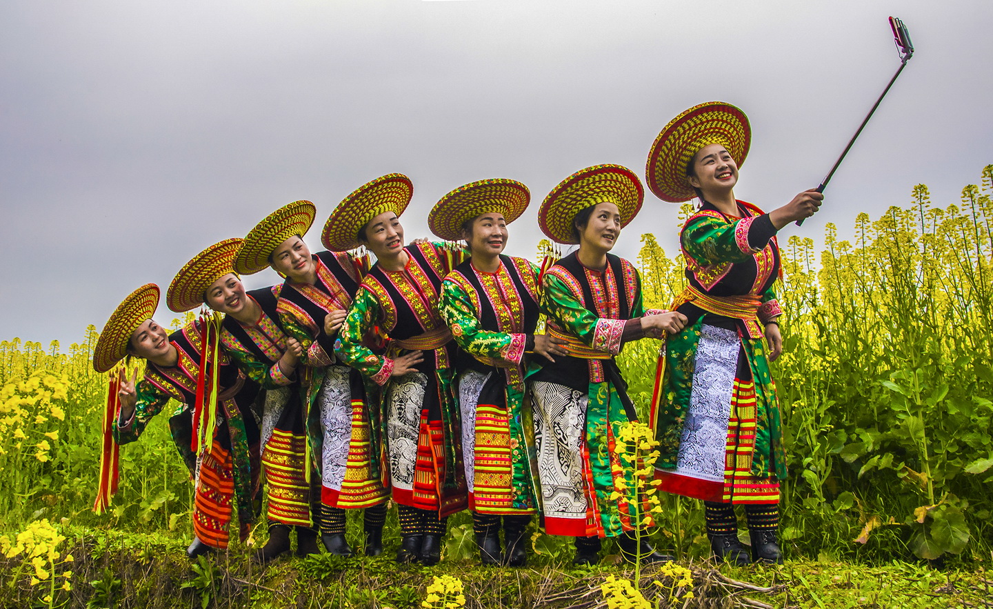 隆回花瑤沙坪三月的油菜花開,吸引著花瑤姑娘們拍照留影。