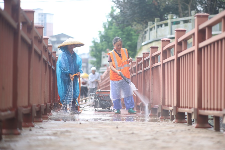 6月23日,通道侗族自治縣雙江河沿河步道,工人在清理淤泥。連日暴雨導致該縣雙江河沿河步道受淹,大量淤泥、雜物堆積。洪水退去后,當地立即組織人員開展清淤和設施檢修作業,全力保障居民正常生活秩序。李尚引 攝