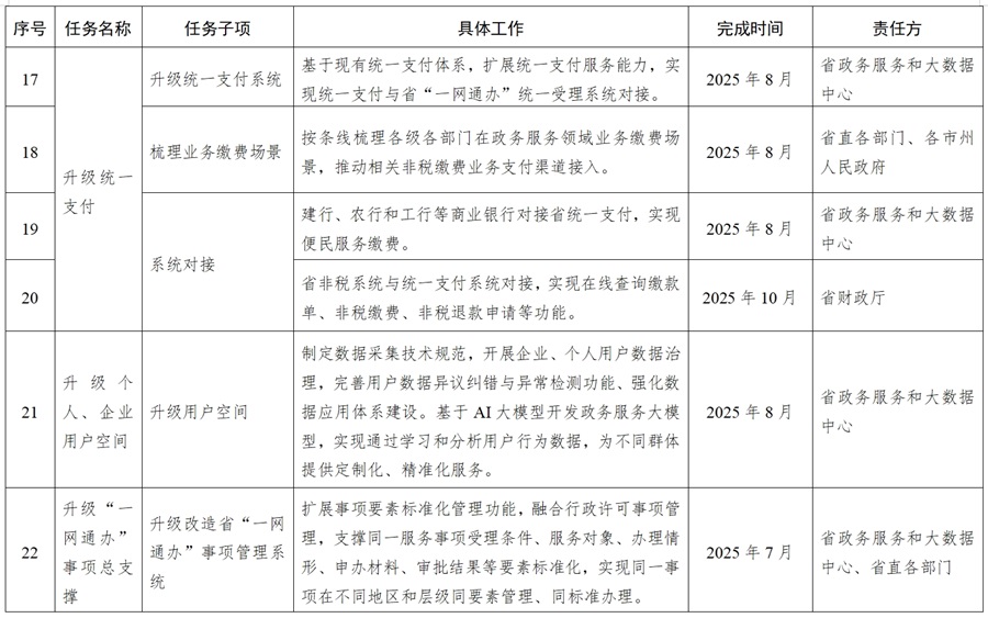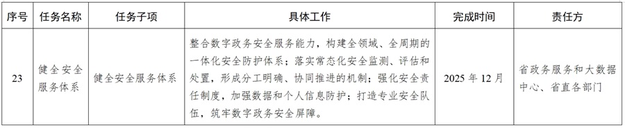 2025年12月31日前,統籌省級政務服務公共平臺基礎能力建設和保障,滿足全省數字政務公共基礎能力“總支撐”需求,通過完善統一身份認證、電子證照、電子印章、統一支付、統一用戶中心、應用能力開放平臺、AI大模型等基礎支撐能力,全面支撐全省政務服務業務應用。整合數字政務應用安全服務能力,實現集中監控與管理,提升整體安全防護水平。