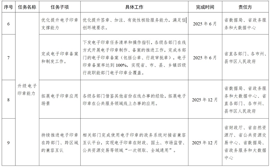 2.升級電子印章應用能力。升級電子印章在線審批、統一授權、統一核驗、電子證照加注、兼容互認等功能及信創環境電子印章應用能力,滿足電子證照和各類政務服務場景下的電子印章應用。各級各部門應完成本部門的電子印章備案申請(包括公章、行政審批章),電子印章備案率達到100%。探索在財政、自然資源和公共資源交易等領域推進電子印章的互信互認。