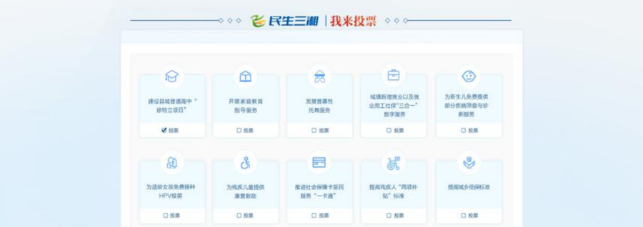 你“盼的事”,就是政府要“干的事”。為了集中力量抓好辦成一批群眾可感可及的實(shí)事,12月18日,湖南省人力資源和社會(huì)保障廳、湖南省政府門戶網(wǎng)站聯(lián)合多家媒體及全省政府網(wǎng)站、政務(wù)新媒體,啟動(dòng)“民生三湘——2024年湖南‘十大重點(diǎn)民生實(shí)事’”初選投票活動(dòng),邀請(qǐng)廣大網(wǎng)友選出最關(guān)心的事,讓它們成為政府重點(diǎn)保障的民生實(shí)事。