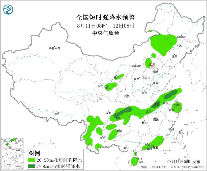 預計8月11日08時至12日08時,內蒙古東部、華北北部、西北地區(qū)東部、西南地區(qū)東部等地的部分地區(qū)將有8級以上雷暴大風或冰雹天氣,其中,內蒙古東部、河北西北部等地的部分地區(qū)將有10級以上雷暴大風,最大風力可達11級以上;內蒙古東部、華北北部、西北地區(qū)東部、江淮、江漢、江南北部、西南地區(qū)東部、華南南部等地的部分地區(qū)將有小時雨量大于20毫米的短時強降水天氣,其中,安徽中部、江蘇中部、湖北西部、四川東南部、重慶中西部和東北部等地的部分地區(qū)小時雨量大于50毫米,最大可達70毫米以上。
