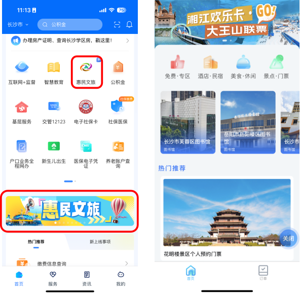 登陸“湘易辦”后,在首頁搜索服務(wù)名稱,或在金剛區(qū)及banner處點(diǎn)擊“惠民文旅”,便可進(jìn)入服務(wù)。