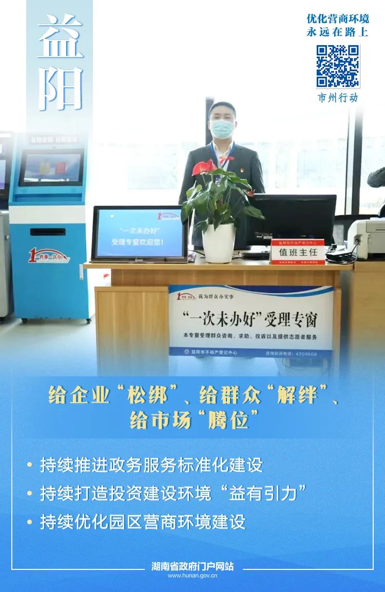 益陽市以開展政務服務、建設環境、園區服務、法治保障等重點攻堅行動長效延續、提質擴面、守正創新,給企業“松綁”、給群眾“解絆”、給市場“騰位”,確保全市部門作風根本轉變,營商環境明顯改善,服務企業水平顯著提升,進一步抬高營商環境坐標,努力爭取在全省營商環境評價中進入“優秀”等次。
