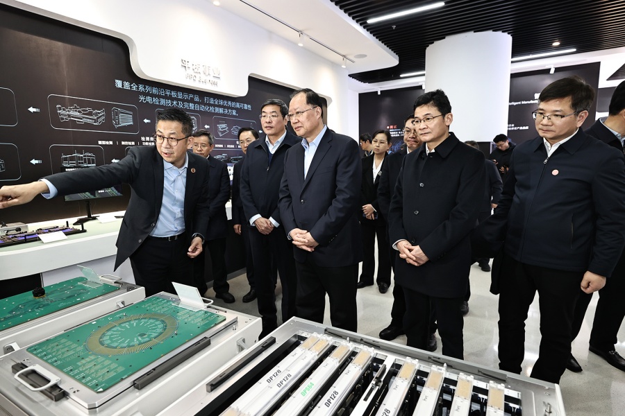 2月20日下午,毛偉明在蘇州華興源創考察。