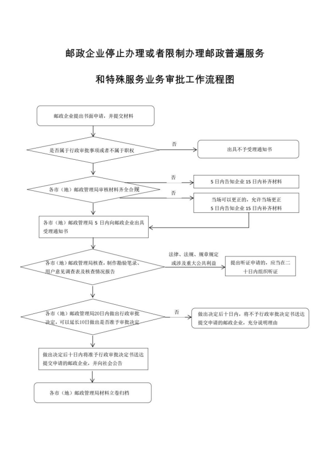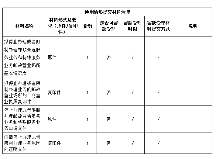 我要申請(qǐng)停止辦理或者限制辦理郵政普遍服務(wù)和郵政特殊服務(wù)業(yè)務(wù)審批(郵政企業(yè))