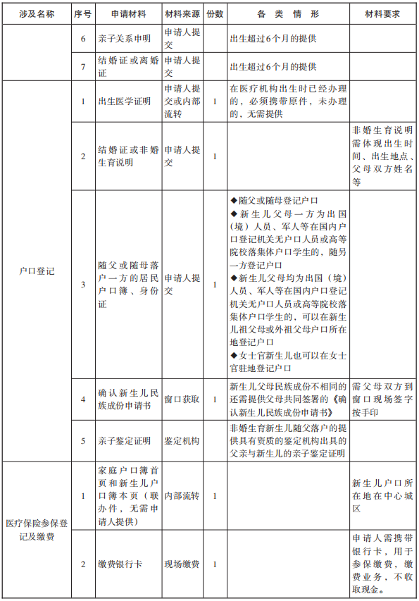 《出生醫(yī)學(xué)證明》1 個(gè)工作日內(nèi),戶口登記 (資料齊全) 1 個(gè)工作日內(nèi),醫(yī)療保險(xiǎn)參保登記及繳費(fèi)1 個(gè)工作日內(nèi)