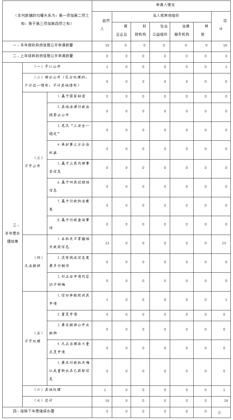 (二)關于依申請公開情況。規范依申請公開工作,根據新修訂的《中華人民共和國政府信息公開條例》,重新梳理依申請公開事項類型及處理方式,制定依申請辦理流程圖,優化受理渠道,明確各環節辦理責任,建立依申請公開事項臺賬,修訂答復書模板,規范救濟途徑表述,依法依規做好答復工作。全年共收到政府信息公開申請16件,均按規定進行了答復。